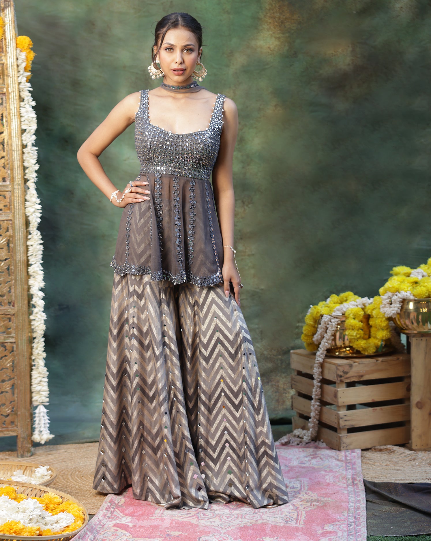 A graceful festive ensemble featuring a georgette grey top adorned with mirror work and delicate pearl highlights for a soft, elegant shimmer. Paired with a flowing chevron-patterned sharara enhanced with mirror accents, the look offers beautiful movement and refined appeal. Finished with a delicate hand mirror–worked neck dupatta, this set is perfect for festive celebrations and modern wedding occasions.