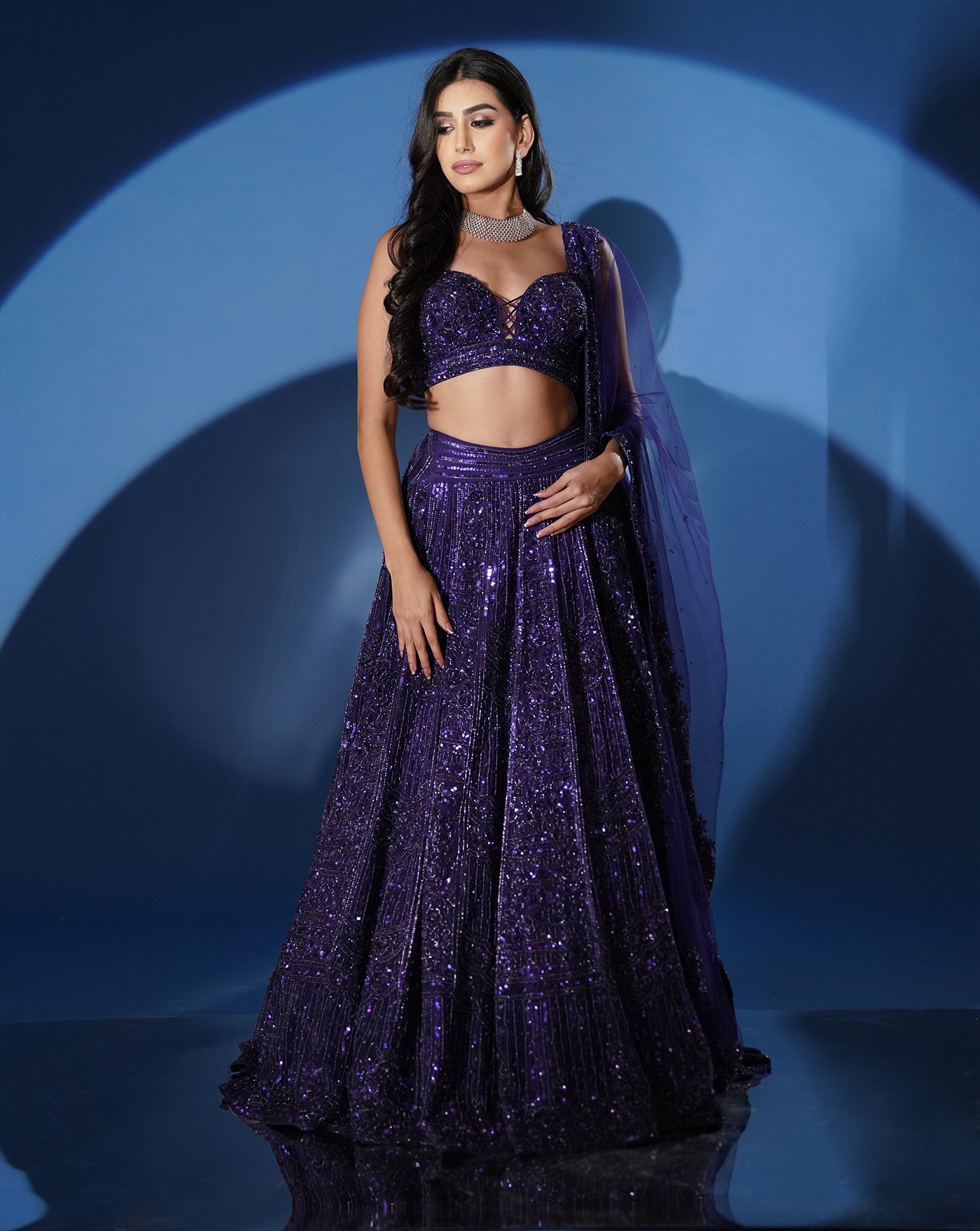 Enveloped within the luminous allure of Electric blue, this hand-embroidered lehenga is crafted to dazzle under the spotlight. The voluminous skirt comes alive with an opulent interplay of sequins, cutdana, and beads, creating a rhythmic sparkle that celebrates every twirl and every beat of the night.The sculpted blouse echoes the same brilliance with intricate embellishments and striking criss-cross detailing that elevates its contemporary silhouette, while the sheer net dupatta offers a soft, graceful balance to the high-shine glamour.Perfect for Sangeet soirées, cocktail celebrations, and evenings meant for dance and delight — this ensemble captures the spirit of celebration with bold elegance.